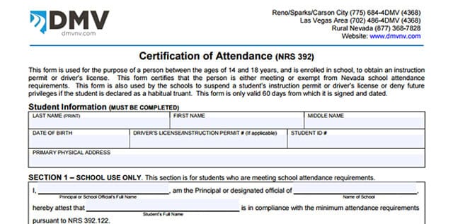 Nevada law mandates that teen drivers under the age of 18 must now present a signed DMV form 301 when applying for a driver’s license. This new form (301) is a certificate signed by a high school official that verifies you meet school attendance requirements. During the summer, when school is out of session, you will have to contact the main CCSD office to handle the research and signing of your certificate. Beginning August 10th, you will need to contact your school directly. You can then make arrangements to get the certificate signed with the appropriate school official.